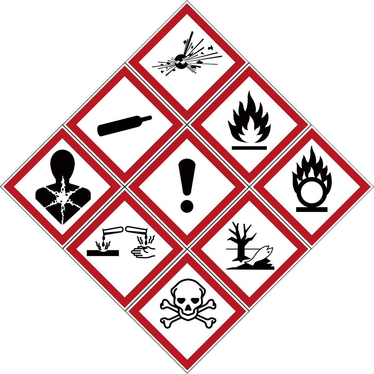 EU kräver att farliga ämnen ska vara försedda med lämpliga GHS/CLP-symboler. Andra relevanta symboler kan läggas till, exempelvis en varningssymbol för varm yta enligt ISO 7010. Relevanta symboler ska grupperas på ena sidan och visas på den gula säkerhetsfärgbakgrunden.